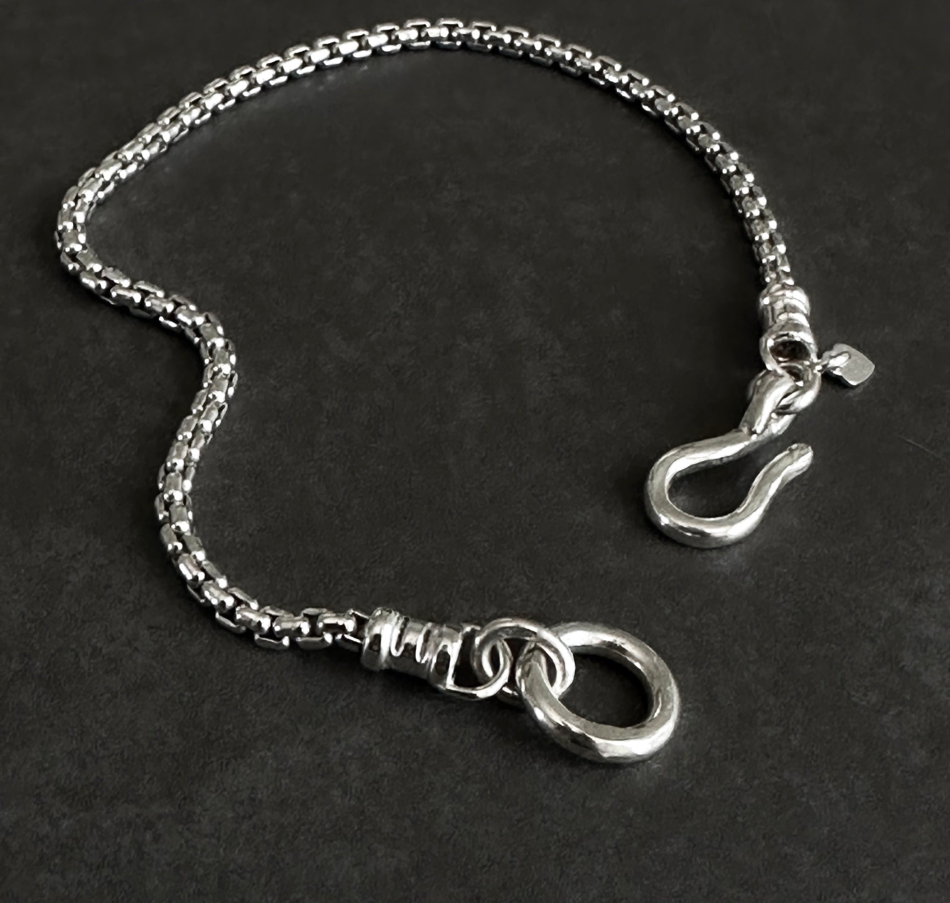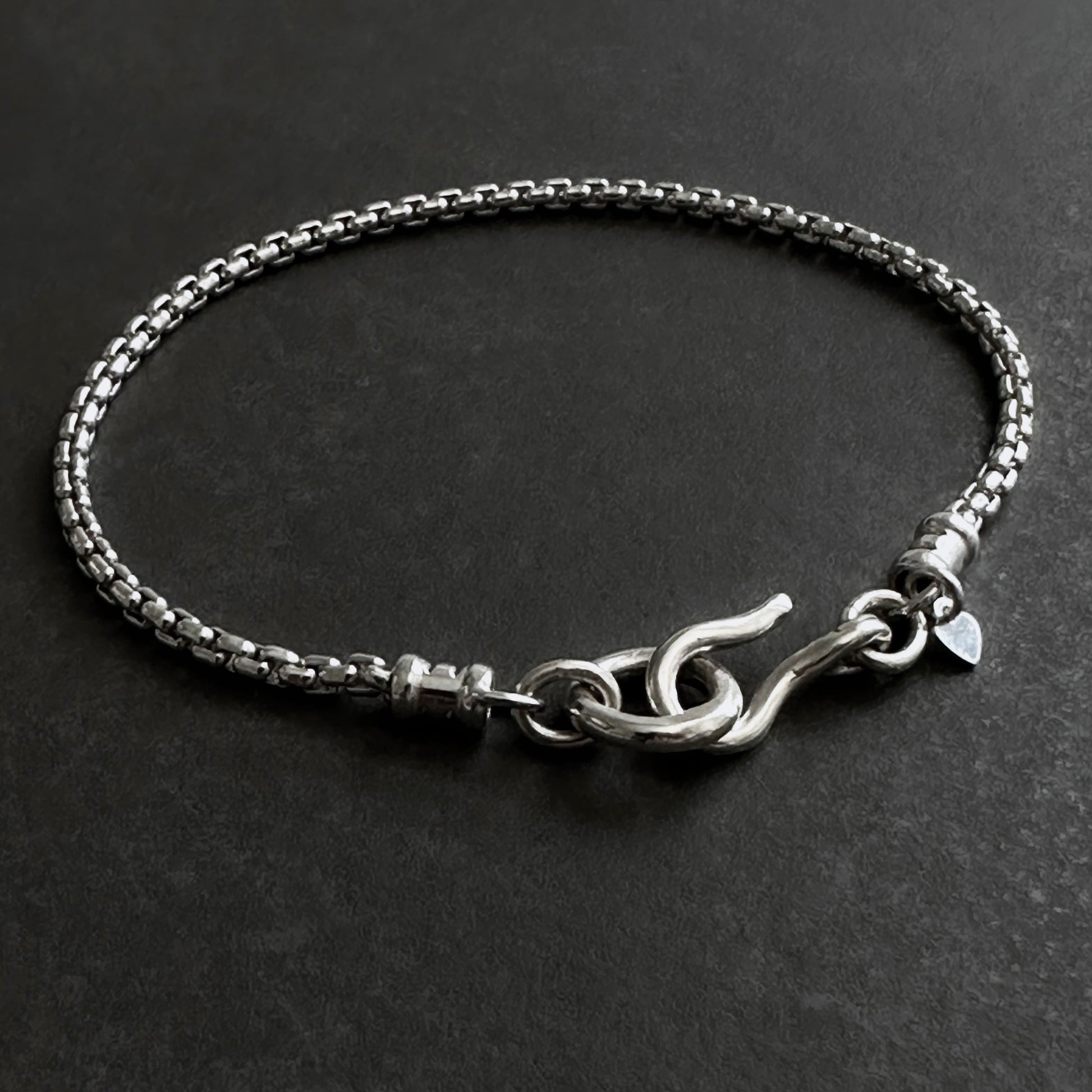 This classic box chain bracelet, in solid sterling silver, features a large hook clasp for easy wear. Suitable for both men and women. This timeless design will be a staple in your accessory collection