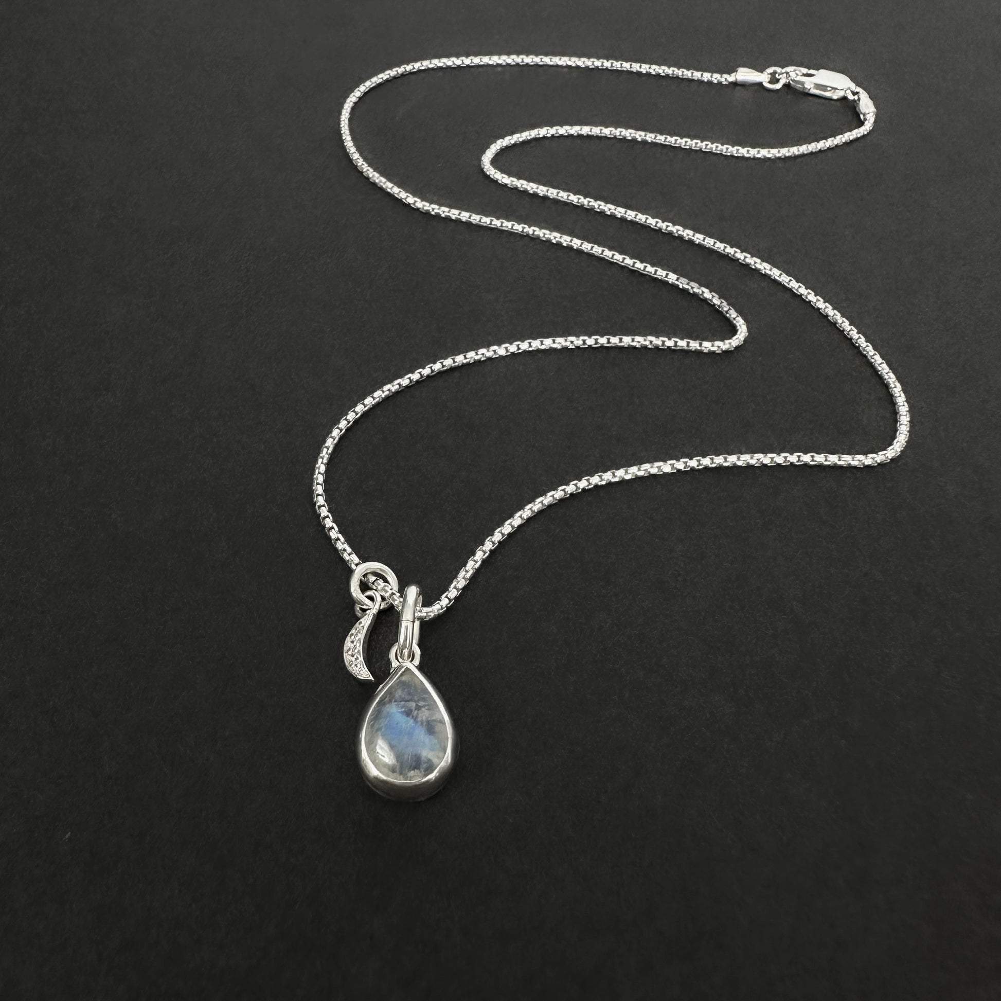 - Pendant charm: Natural Rainbow Moonstone pendant pear shaped, 8x10mm, with tiny pave cz crescent moon